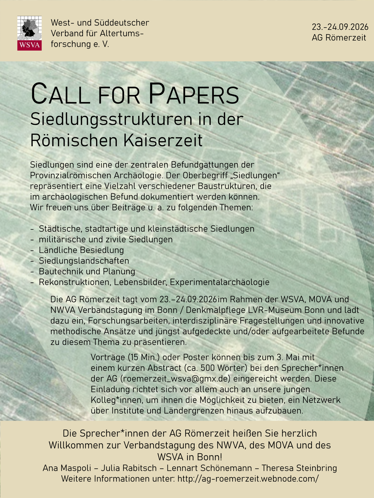 Vorträge (15 Min.) oder Poster können bis zum 3. Mai mit einem kurzen Abstract (ca. 500 Wörter) bei den Sprecher*innen der AG (roemerzeit_wsva@gmx.de) eingereicht werden.